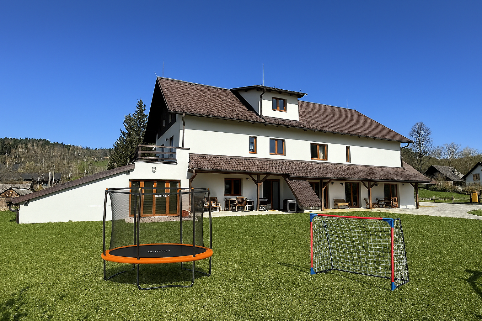 Pro děti: Nechybí velká trampolína a fotbalové branky, pískoviště, apod.